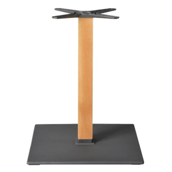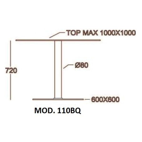 Podnožje za mizo art. 110BQ je izdelan iz kvadratne litoželezne spodnje plošče, ene jeklene kvadratne cevi ali enega lesenega stebra (bukev natur ali wenge) in enega križa za pritrditev mizne plošče (iz litega aluminija). Podnožje in križ so prašno lakirani z epoxi lakom črne barve. Podnožja se lahko na željo barvajo tudi v vseh barvah iz RAL lestvice. Spodnja plošča ima 4 lepilne blazinice in 4 ABS čepke. To podnožje uporabljamo v notranjih in zunanjih prostorih. Primerno je za zunanje terase, kavarne, bare, restavracije, itd...