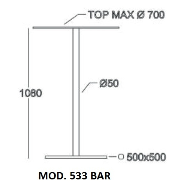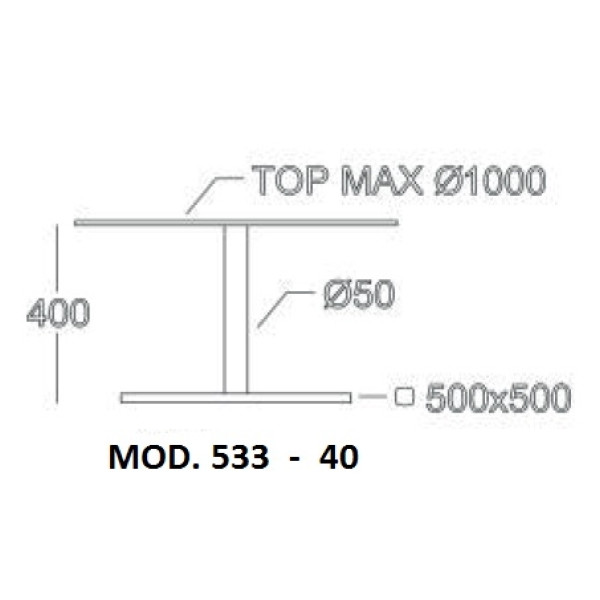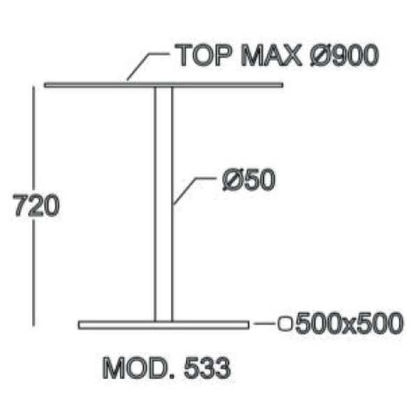Podnožje za mizo art. 533 je izdelan iz inox kromirane ali satinirane spodnje plošče, inox kromirane ali satinirane okrogle cevi in križa za pritrditev mizne plošče (iz litega aluminija). Križ je prašno lakiran z epoxi lakom črne barve. Podnožja se lahko na željo barvajo tudi v vseh barvah iz RAL lestvice. Spodnja plošča ima 4 lepilne blazinice in 4 ABS čepke. To podnožje uporabljamo v notranjih in zunanjih prostorih. Primerno za zunanjo uporabo je satiniran inox.