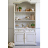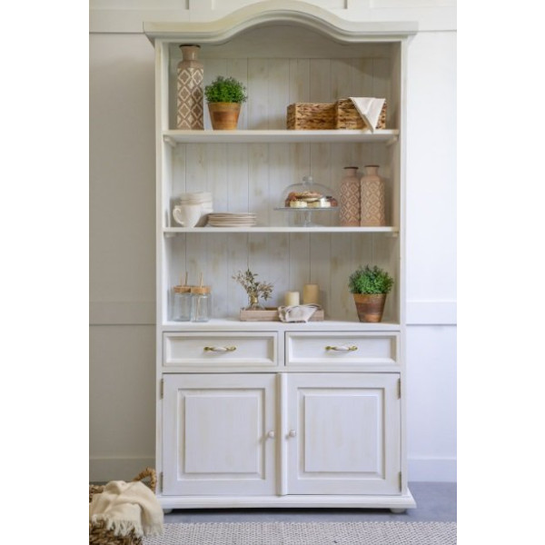 Ročaji na 2 predalih so kovinski ročno izdelani. V regalu so 2 fiksni polici, spodaj pa dvojna vratica. Po naročilu je možnost montaže Blumovih vodil za predale z mehkim zapiranjem.
