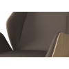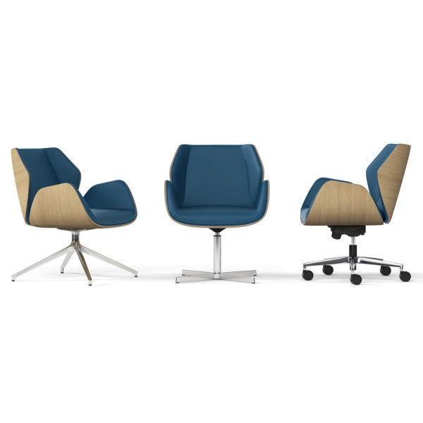 Sedišče in hrbtišče:  školjka iz vezane plošče - les oblazinjena v blago, eco usnje ali goveje usnje različnih barv. Možnost školjke - vezane plošče v hrast natur izvedbi Stol ima nizek hrbtni naslon