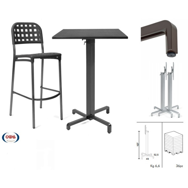 Podnožje za barsko mizo IBIS je izdelano iz polyestersko zaščitenega aluminija in je odporno na vremenske vplive. To podnožje ima vgrajen sistem za preklop mizne plošče in prilagojene noge za zlaganje več miz skupaj. Z uporabo tega podnožja rešimo problem tam, kjer ni veliko prostora za zimsko spravilo miz.