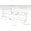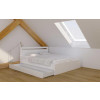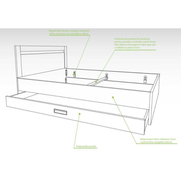 Postelja s predalom BRIDGE je izdelana iz oplemenitene iverne plošče debeline 25mm, ter zaključena z ABS trakom katerega robovi so rahlo zaokroženi. Postelja s širino160, 180 ali 200 cm ima vgrajeno sredinsko nosilno letev na katero je pritrjena sredinska noga, ki podpira ležišče na sredini. Okvir postelje je spojen s kovinskim spojnim okovjem, ki ga lahko montiramo na različnih višinah. S tem prilagodimo postavitev vzmetnice na ustrezno višino v razponu od 42 do 55 cm višine. Višje kot je vzmetnica, lažje vstajamo iz postelje.Pod ležiščem je dodan izvlečni predal po celi dolžiniv katerega lahko spravimo vso posteljnino ali pa kaj drugega. Če uporabljate nočno omarico je predal temu primerno krajši po dolžini.