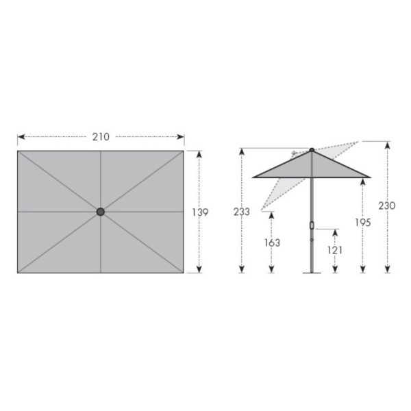 Senčnik ACTIVE 210 x 140 cm je senčnik z aluminijastim centralnim drogom srebrne barve in avtomatskim pregibom, ki se uvršča med male senčnike. V glavnem je namenjen za uporabo na hotelskih balkonih in terasah.