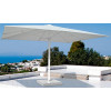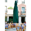 Senčnik s centralnim drogom in teleskopskim sistemom zapiranja nad mizami.