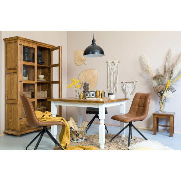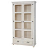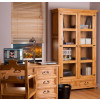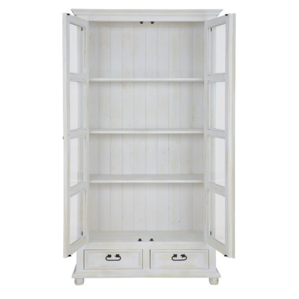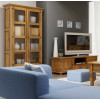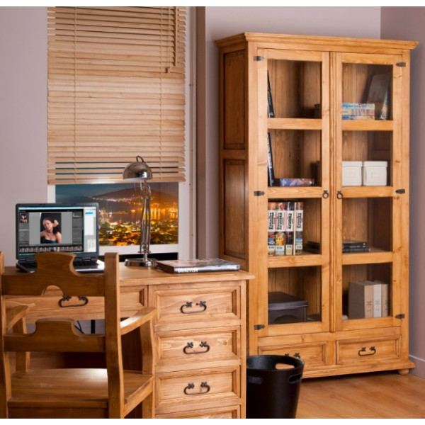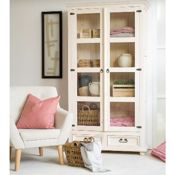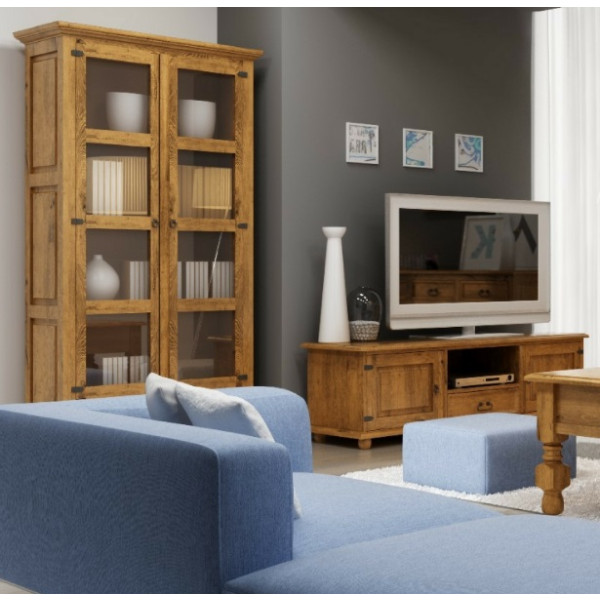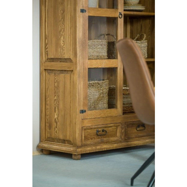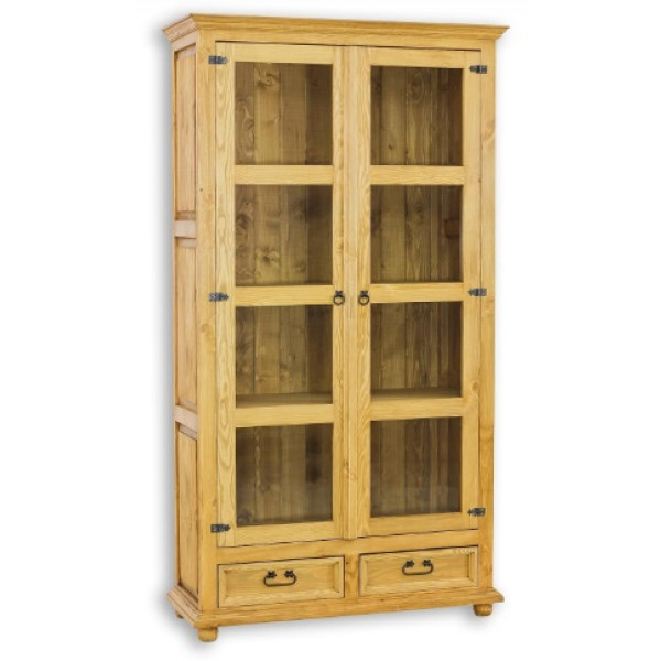 Vitrina DORA 07 je izdelana iz masivnega borovega lesa. Stranice vitrine imajo vrezkane profile - utore.