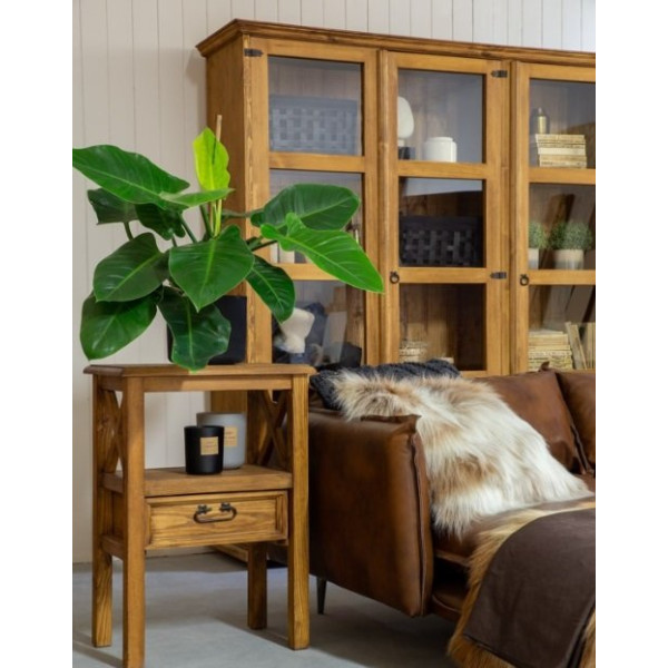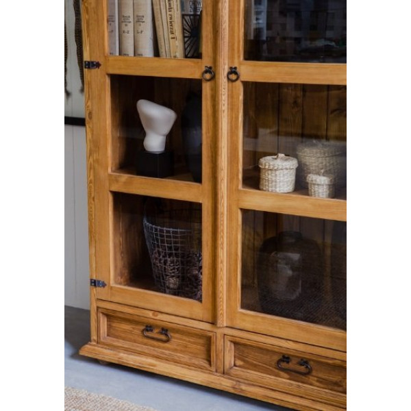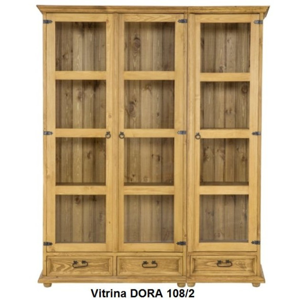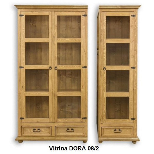 Vitrina DORA 08/2 je izdelana iz masivnega borovega lesa v dveh kosih - 2D vitrina + 1D vitrina (zaradi lažjega vnosa v vaš prostor). Vitrina ima zastekljena vrata, za vrati pa 3 police. Spodaj so 3 predali.
