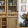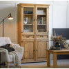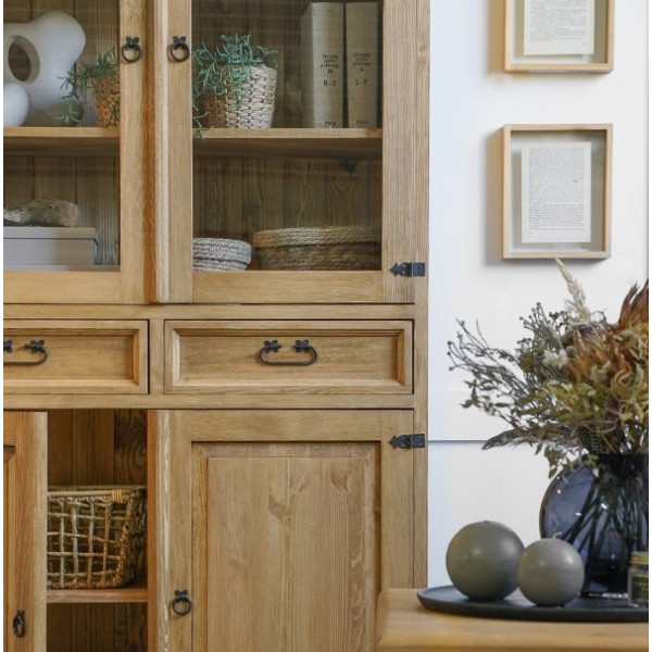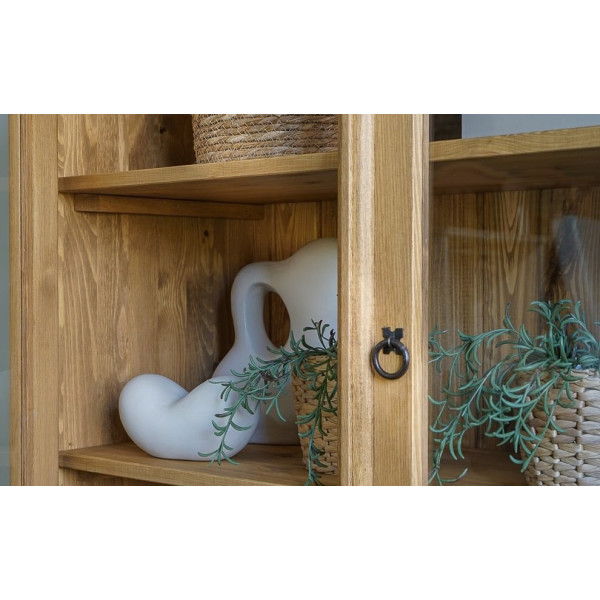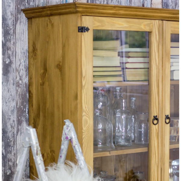 Vitrina ZALKA 13 je dvodelna vitrina izdelana iz masivnega borovega lesa. Stranice vitrine so ravne brez utorov.