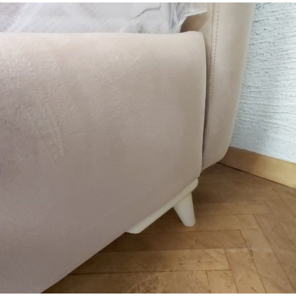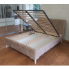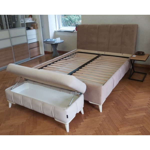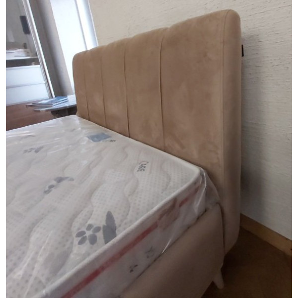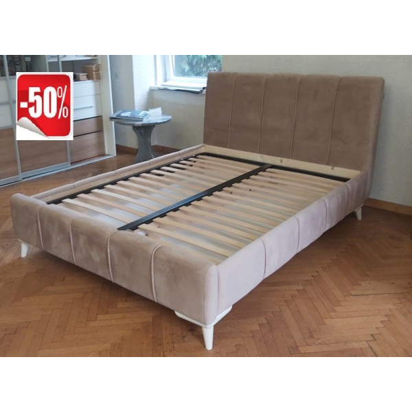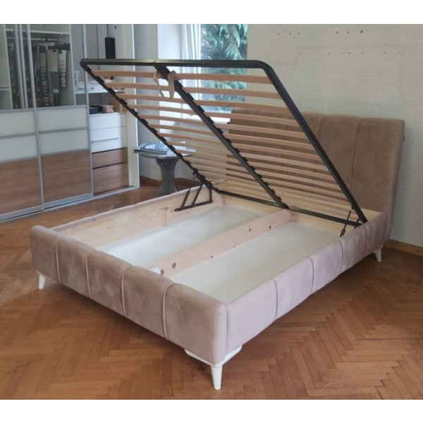Ležišče velikosti 200 x 160 cm. Ležišče je dvižno z amortizerjem, kovinski okvir z vstavljenimi latoflex prožnimi letvicami. Ogrodje postelje je iz masivnega lesa ter oblazinjeno v rjavo mikrofibro. Postelja je dvignjena na lesenih nogicah, kar omogoča sesanje robota pod posteljo.